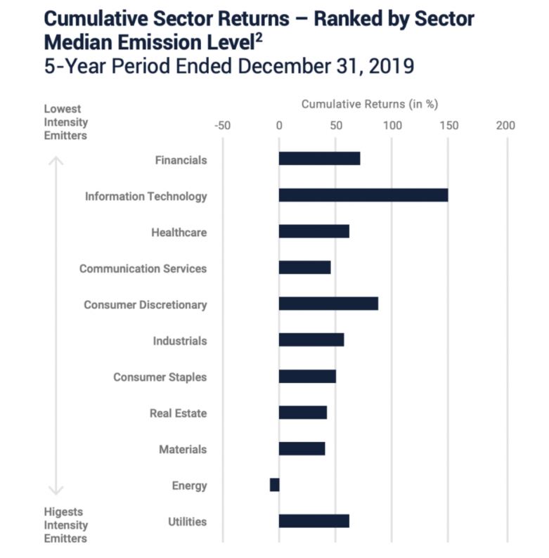 2. Source: Bloomberg, as of X/X/2020. Data for five-year period ending 12/31/2019. The underlying universe is comprised of all S&P 500 companies that reported carbon emissions for 2018 (251 companies reporting), grouped into their respective sectors. Reporting companies were grouped by carbon emissions intensity levels from highest emission intensity companies to lowest emission intensity companies based on 2018 reporting levels. Past performance is not an indicator of future results. Returns are total returns and represent investment of dividends.